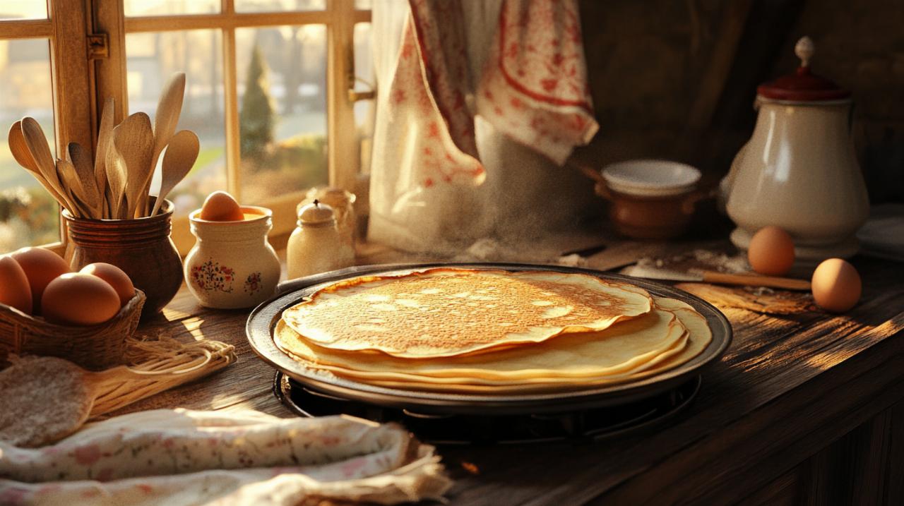 La recette de base pour réaliser environ quinze crêpes nécessite deux cent cinquante grammes de farine de blé, quatre œufs, cinquante centilitres de lait, deux cuillères à soupe de sucre, une pincée de sel et quarante grammes de beurre fondu. Dans un saladier, on mélange d'abord la farine avec le sucre et le sel, puis on incorpore les œufs un à un avant d'ajouter progressivement le lait pour éviter les grumeaux. Le beurre fondu vient enrichir la préparation en fin de mélange. Il est essentiel de laisser reposer cette pâte pendant au moins une heure au réfrigérateur, permettant au gluten de se détendre et aux arômes de se développer. Certaines variantes régionales, comme les Ejerkueche alsaciennes, apportent leur propre caractère. La crêpe dentelle, quant à elle, serait née d'une étourderie ou d'une volonté d'innovation, créant ces galettes ultra-fines et croustillantes qui ravissent les gourmands. Pour la cuisson, une poêle bien chaude légèrement beurrée garantit des crêpes dorées et uniformes. L'art de la crêpe réside aussi dans le geste : verser juste ce qu'il faut de pâte et répartir rapidement en inclinant la poêle dans tous les sens.